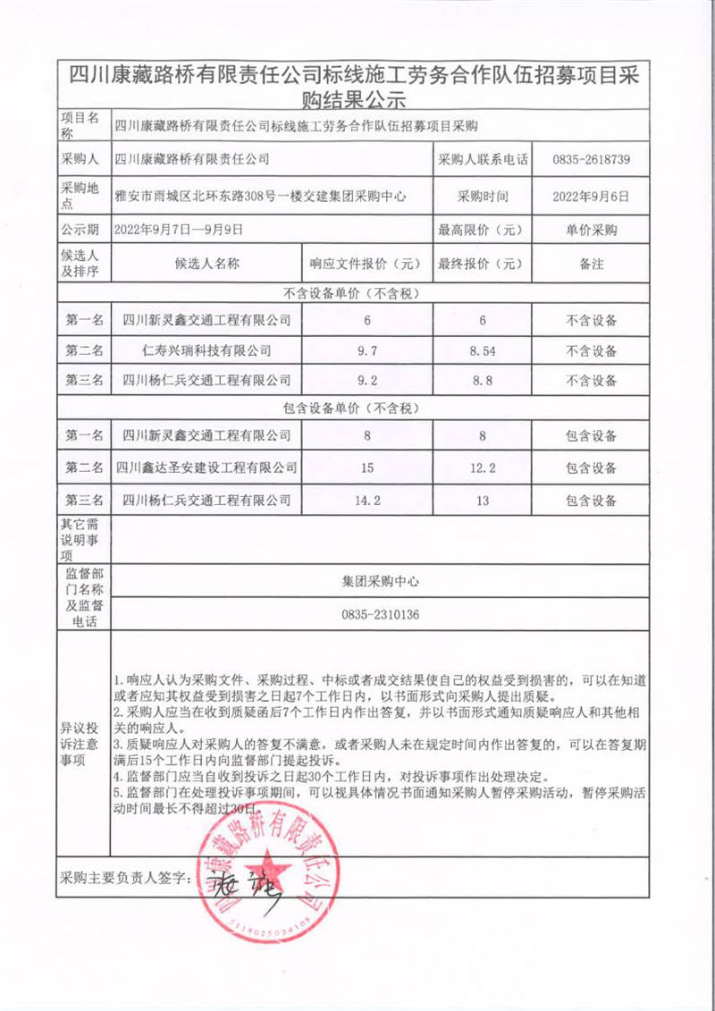 四川康藏路橋有限責(zé)任公司標(biāo)線施工勞務(wù)合作隊伍招募項目采購結(jié)果公示