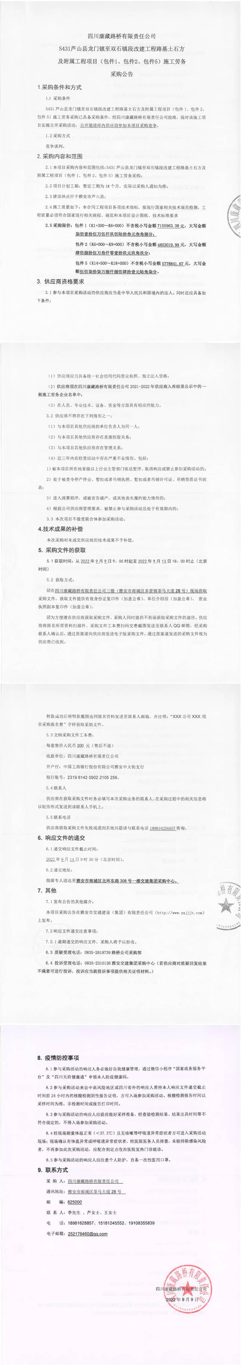 四川康藏路橋有限責任公司S431蘆山縣龍門鎮(zhèn)至雙石段改建工程路基土石方及附屬工程項目(包件1、包件2、包件5)施工勞務采購公告