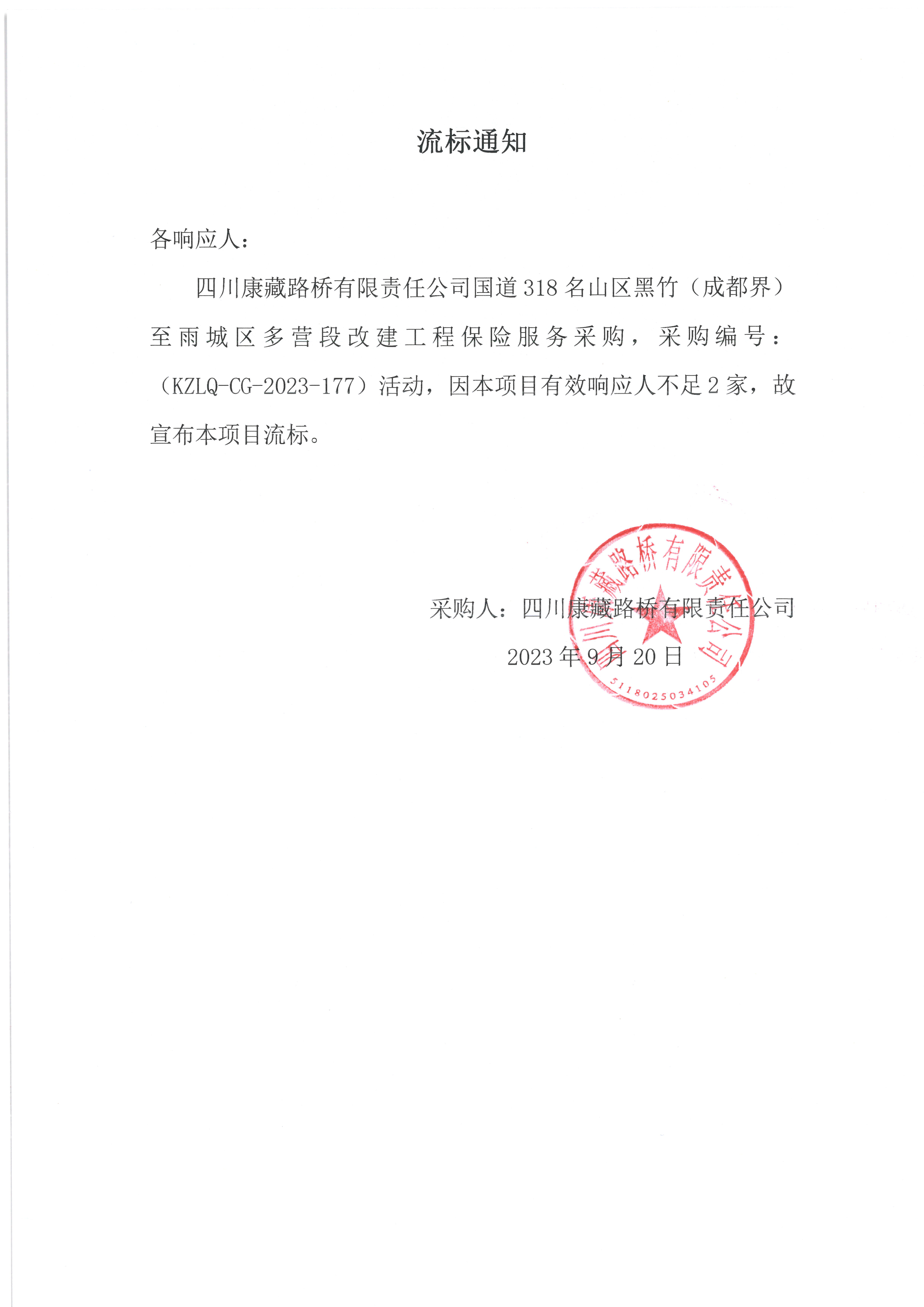 四川康藏路橋有限責(zé)任公司國道318名山區(qū)黑竹(成都界)至雨城區(qū)多營段改建工程保險服務(wù)采購流標(biāo)通知