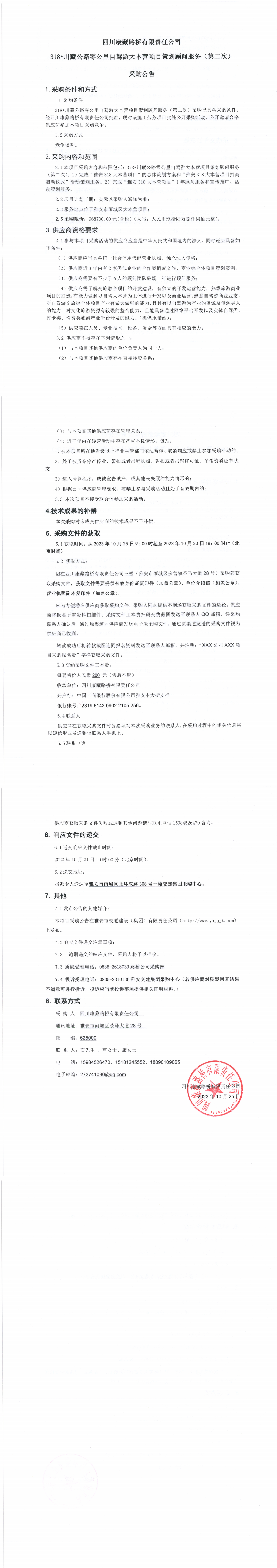 四川康藏路橋有限責(zé)任公司318•川藏公路零公里自駕游大本營項(xiàng)目策劃顧問服務(wù)(第二次)采購公告