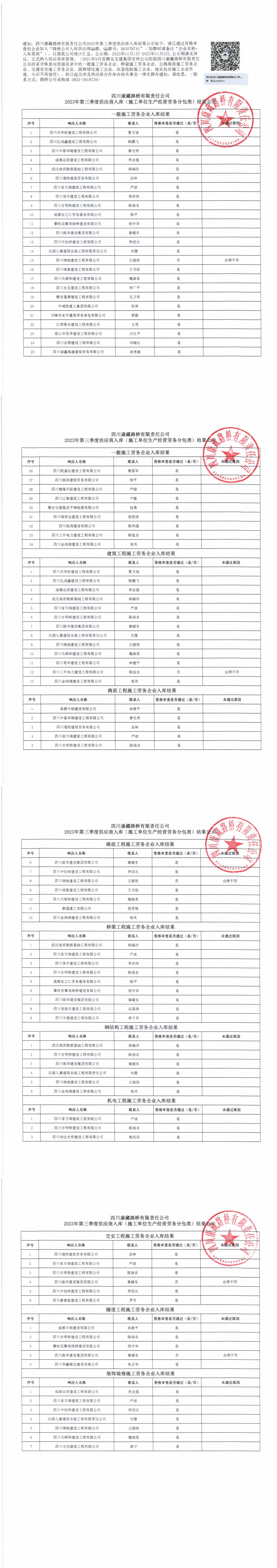 四川康藏路橋有限責(zé)任公司2023年第三季度供應(yīng)商入庫(施工單位生產(chǎn)經(jīng)營勞務(wù)分包類)結(jié)果公示