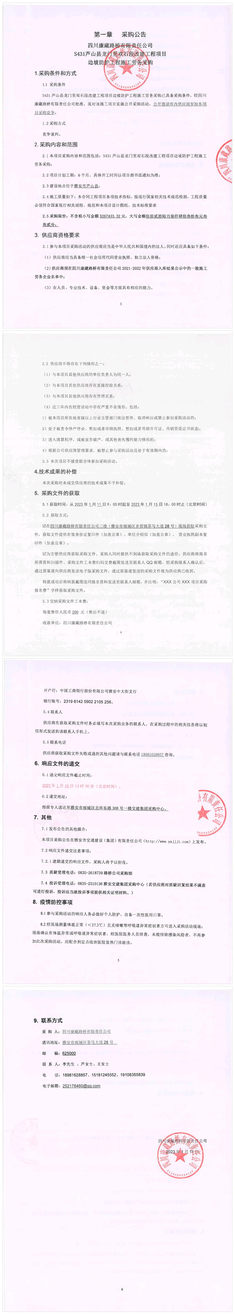 四川康藏路橋有限責(zé)任公司S431蘆山縣龍門至雙石段改建工程項(xiàng)目邊坡防護(hù)工程施工勞務(wù)采購(gòu)公告