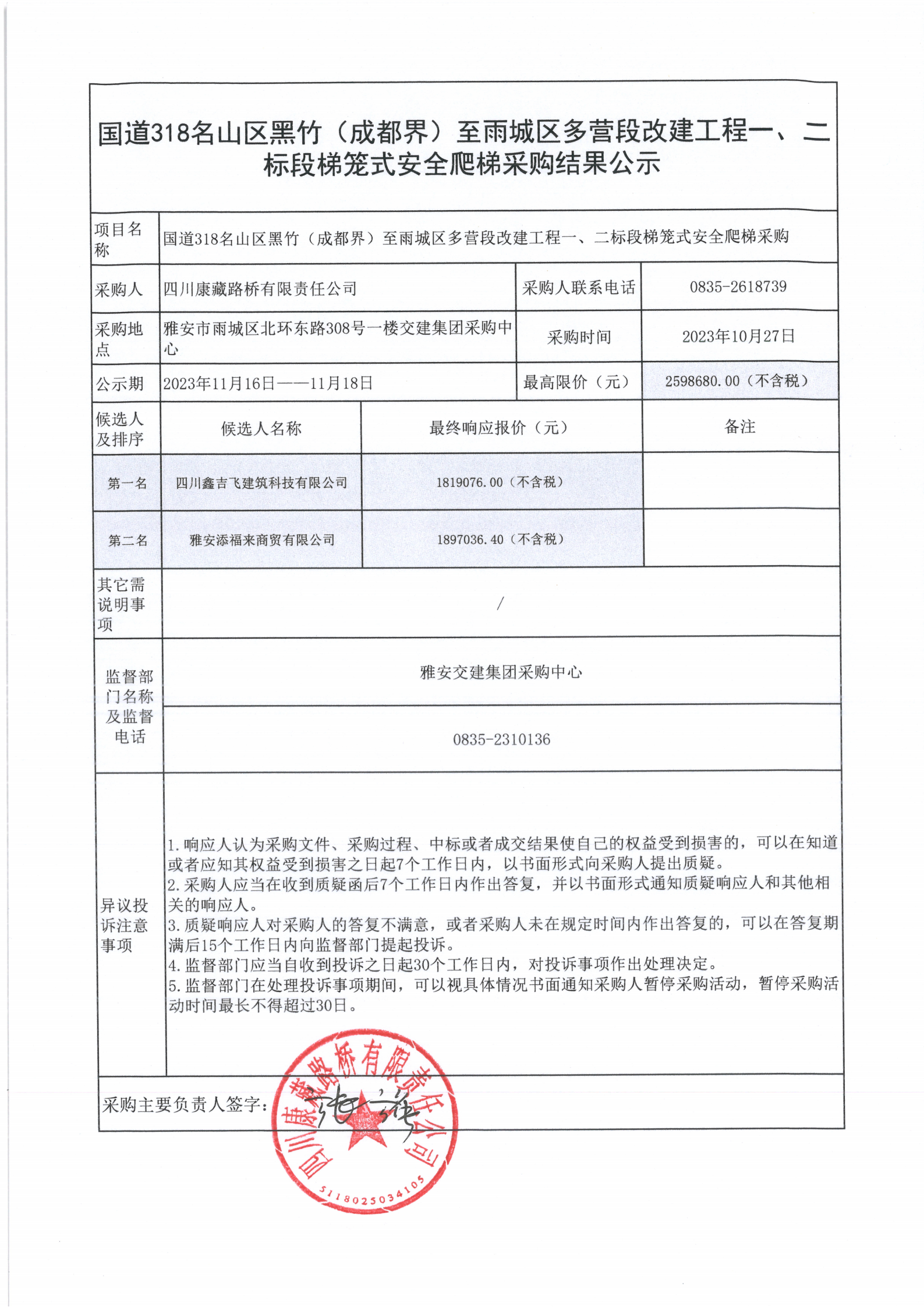 四川康藏路橋有限責(zé)任公司國道318名山區(qū)黑竹(成都界)至雨城區(qū)多營段改建工程一、二標(biāo)段梯籠式安全爬梯采購結(jié)果公示