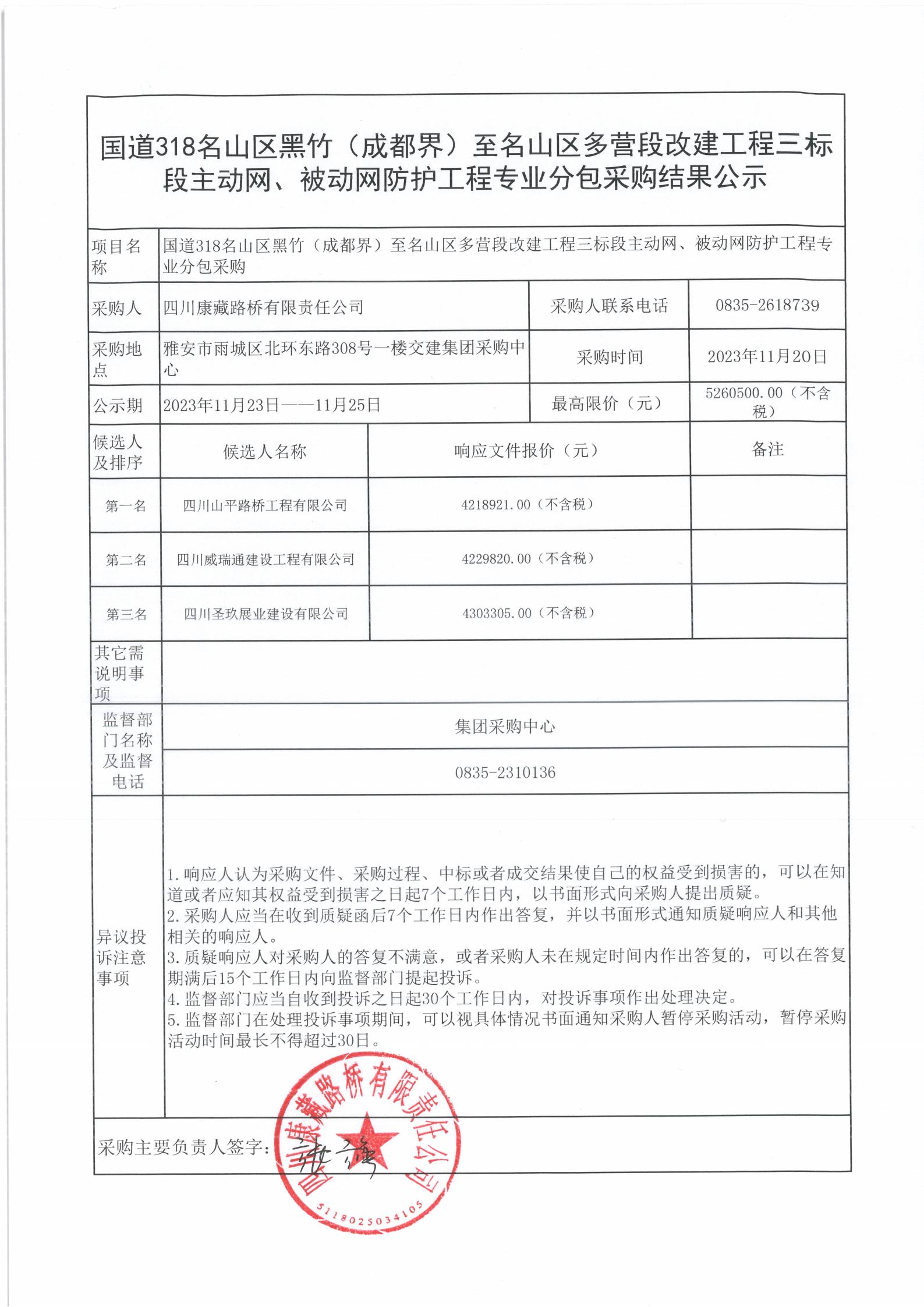 四川康藏路橋有限責(zé)任公司國(guó)道318名山區(qū)黑竹(成都界)至名山區(qū)多營(yíng)段改建工程三標(biāo)段主動(dòng)網(wǎng)、被動(dòng)網(wǎng)防護(hù)工程專業(yè)分包采購(gòu)結(jié)果公示