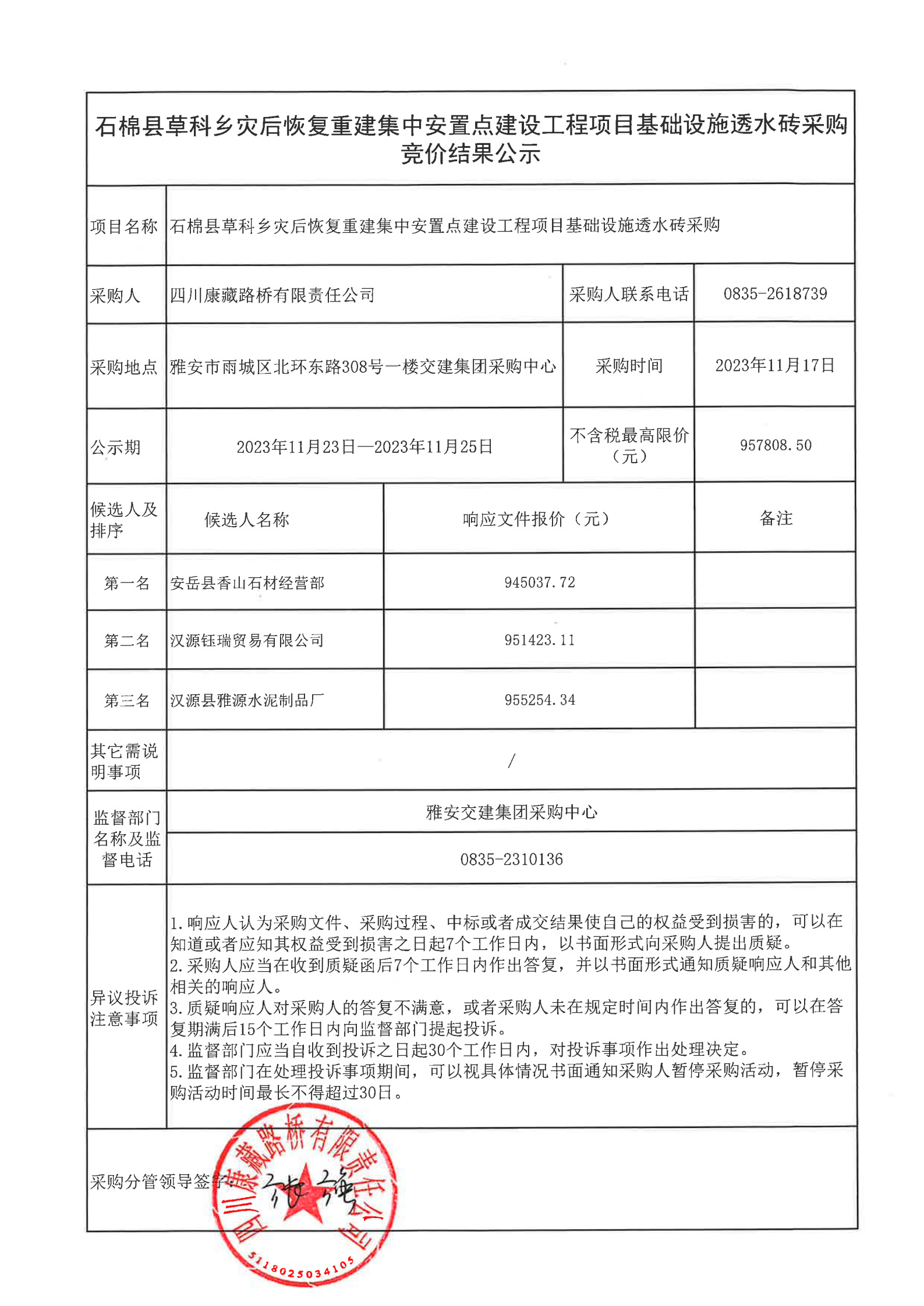 四川康藏路橋有限責(zé)任公司石棉縣草科鄉(xiāng)集中安置點(diǎn)重建工程項(xiàng)目透水磚采購(gòu)結(jié)果公示