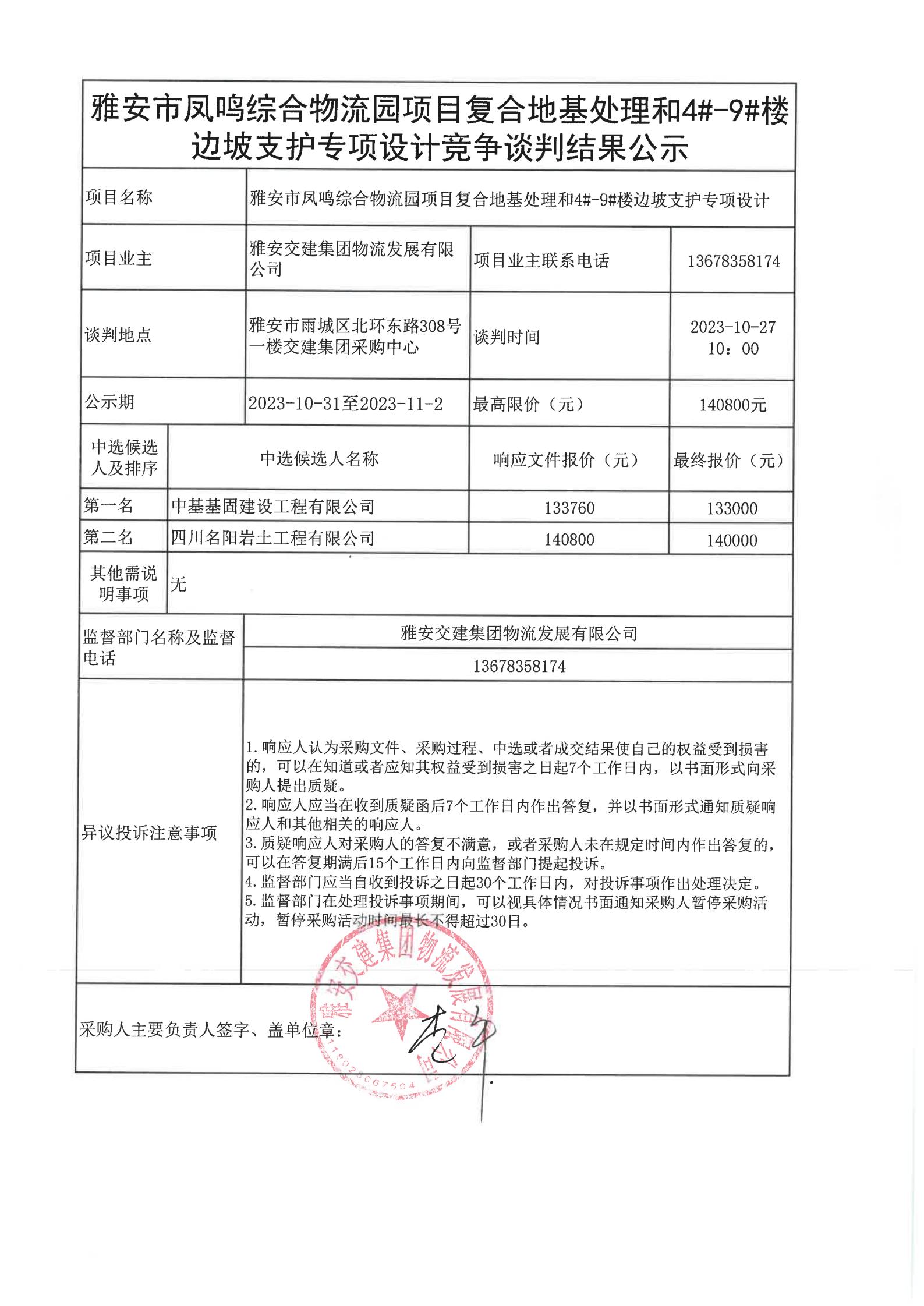 雅安交建集團物流發(fā)展有限公司雅安市鳳鳴綜合物流園項目復合地基處理和4#-9#樓邊坡支護專項設(shè)計競爭談判結(jié)果公示
