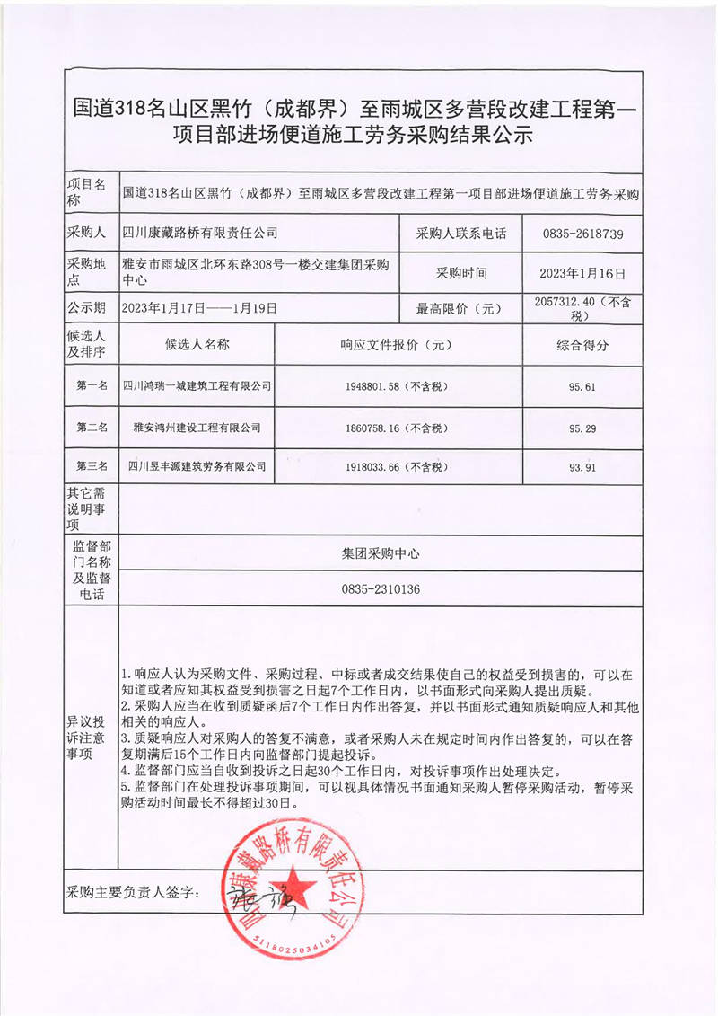 四川康藏路橋有限責(zé)任公司國道318名山區(qū)黑竹(成都界)至雨城區(qū)多營段改建工程第一項(xiàng)目部進(jìn)場(chǎng)便道施工勞務(wù)采購結(jié)果公示