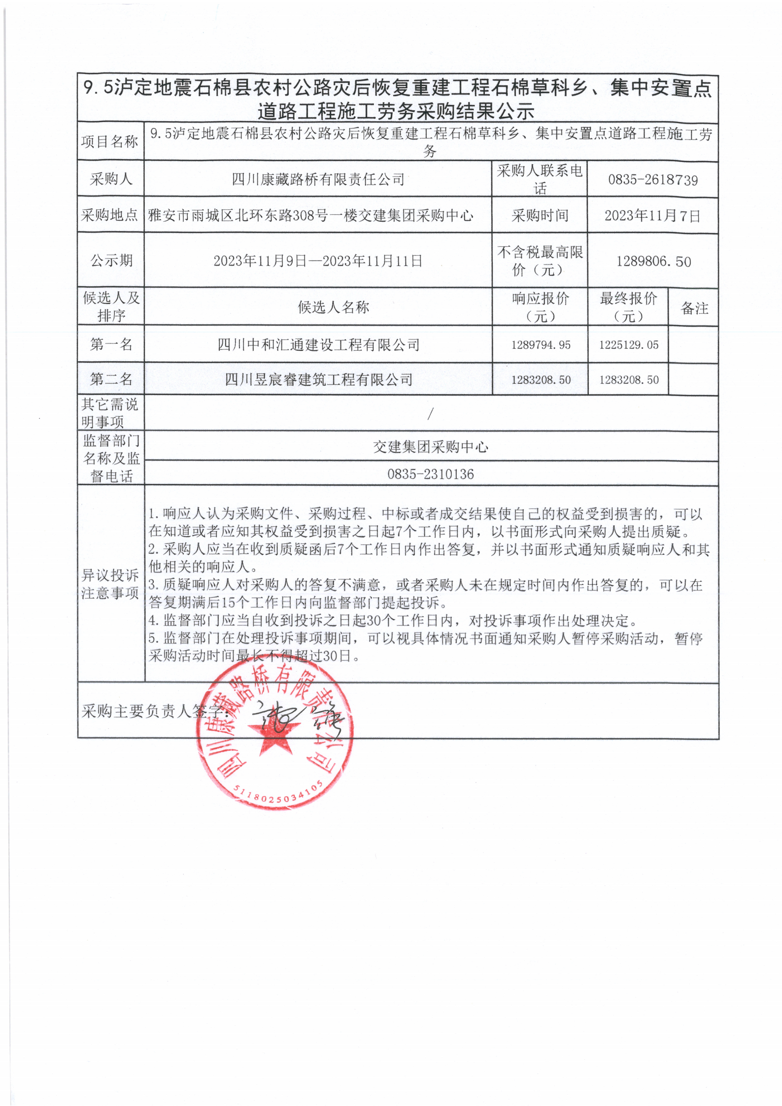 四川康藏路橋有限責(zé)任公司9.5瀘定地震石棉縣農(nóng)村公路災(zāi)后恢復(fù)重建工程石棉草科鄉(xiāng)、集中安置點(diǎn)道路工程施工勞務(wù)采購(gòu)結(jié)果公示