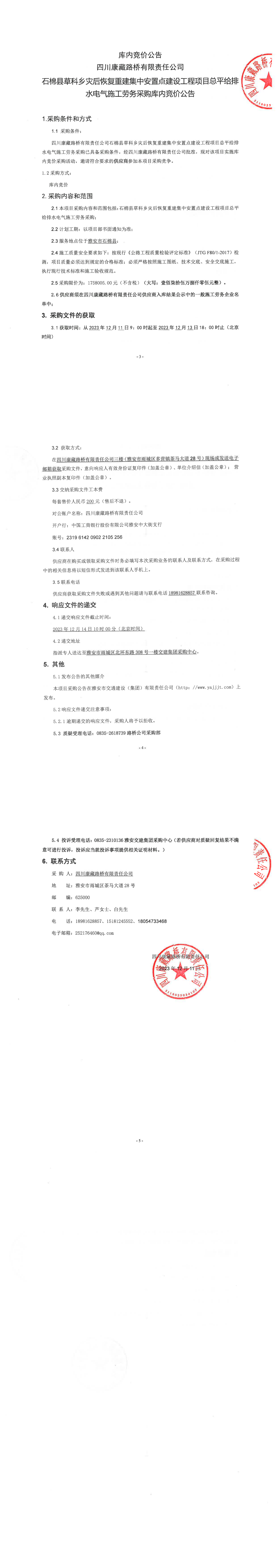 四川康藏路橋有限責任公司石棉縣草科鄉(xiāng)災(zāi)后恢復(fù)重建集中安置點建設(shè)工程項目總平給排水電氣施工勞務(wù)采購庫內(nèi)競價公告