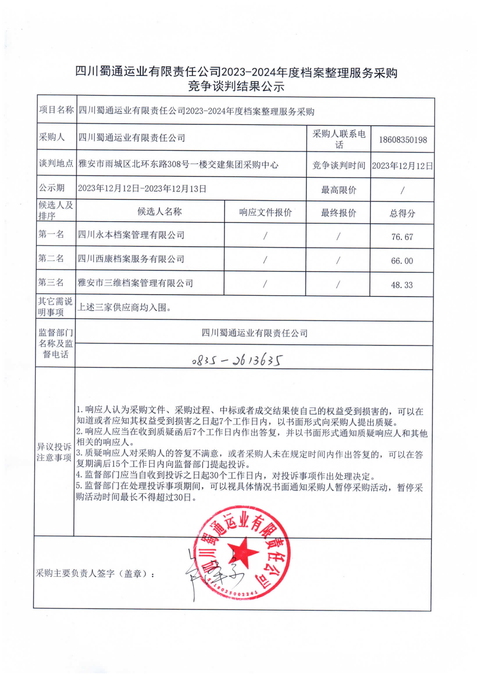 四川蜀通運(yùn)業(yè)有限責(zé)任公司2023-2024年度檔案整理服務(wù)采購競爭談判結(jié)果公示