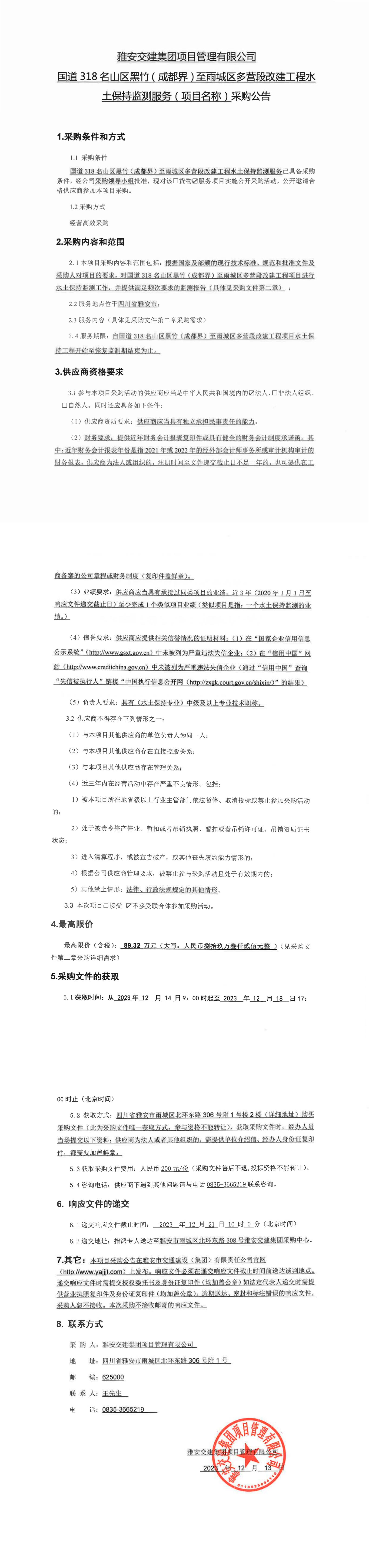 雅安交建集團(tuán)項(xiàng)目管理有限公司國(guó)道318名山區(qū)黑竹(成都界)至雨城區(qū)多營(yíng)段改建工程水土保持監(jiān)測(cè)服務(wù)(項(xiàng)目名稱(chēng))采購(gòu)公告