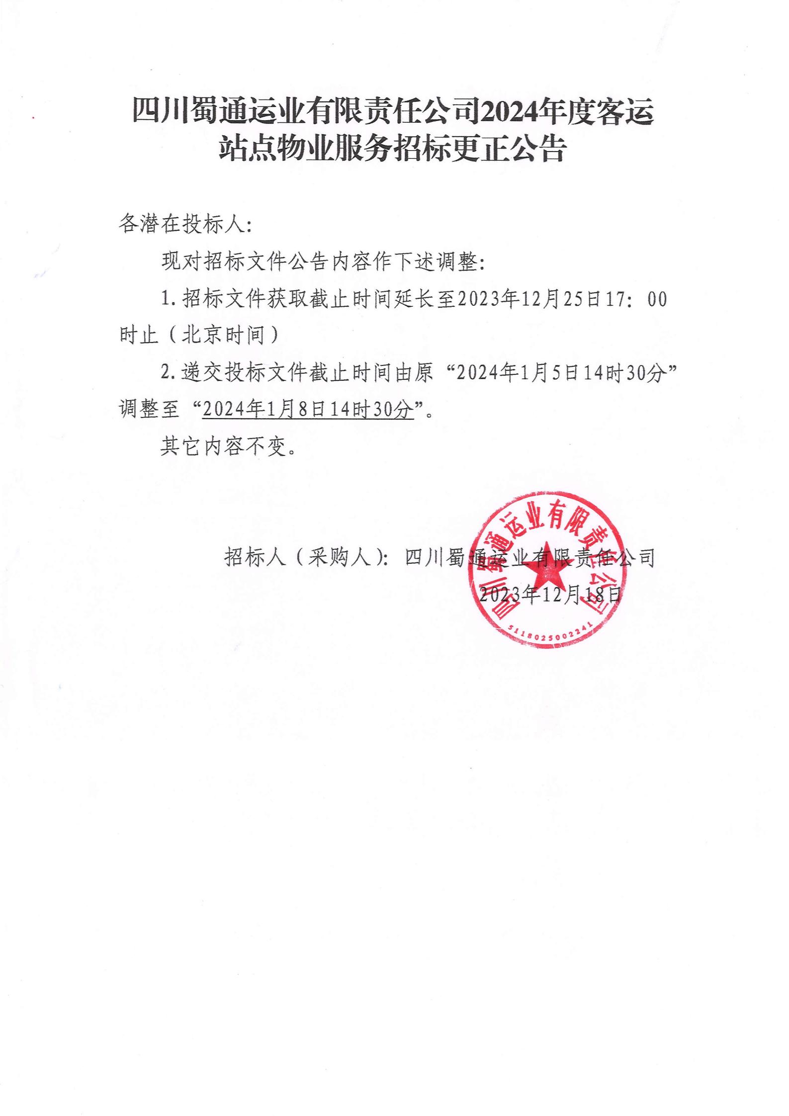 四川蜀通運(yùn)業(yè)有限責(zé)任公司2024年度客運(yùn)站點(diǎn)物業(yè)服務(wù)招標(biāo)更正公告