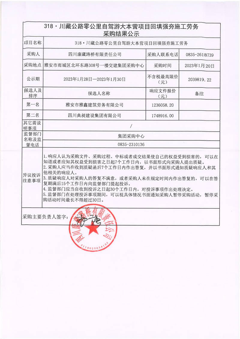 四川康藏路橋有限責任公司318.川藏公路零公里自駕游大本營項目回填強夯施工勞務采購結果公示