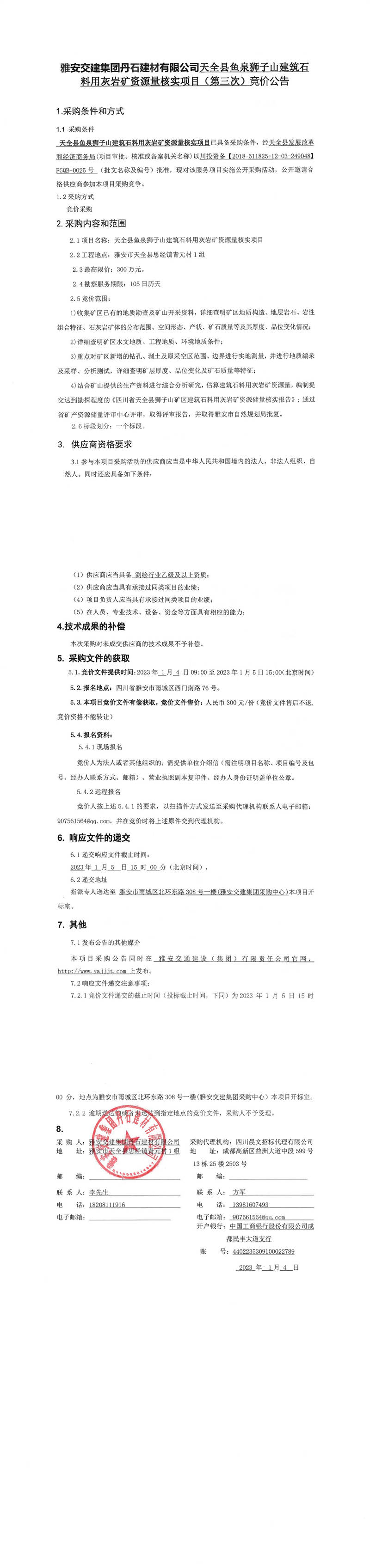 雅安交建集團(tuán)丹石建材有限公司天全縣魚泉獅子山建筑石料用灰?guī)r礦資源量核實(shí)項(xiàng)目(第三次)競(jìng)價(jià)公告