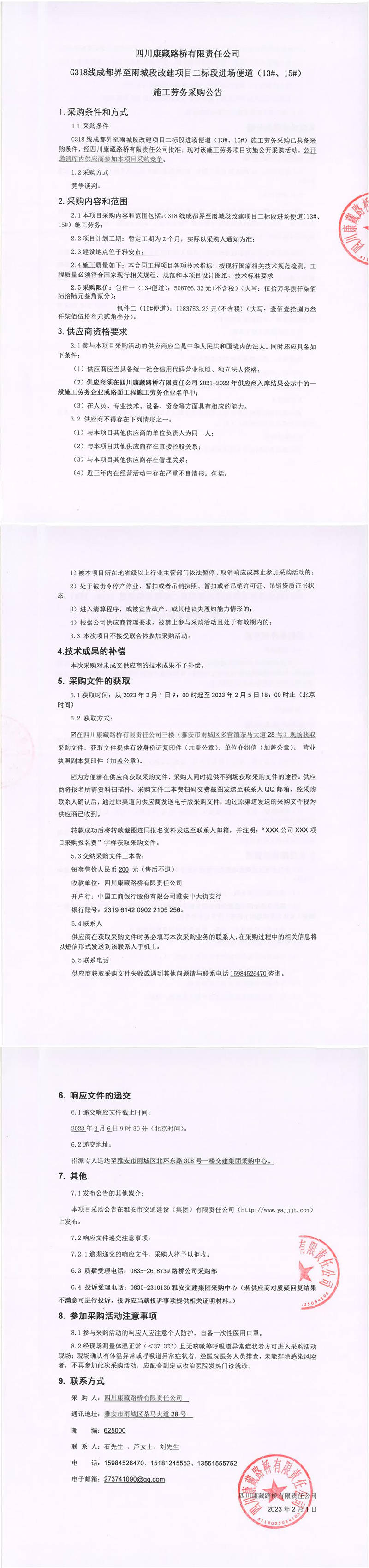 四川康藏路橋有限責(zé)任公司G318線成都界至雨城段改建項(xiàng)目二標(biāo)段進(jìn)場(chǎng)便道(13#、15#)施工勞務(wù)采購(gòu)公告