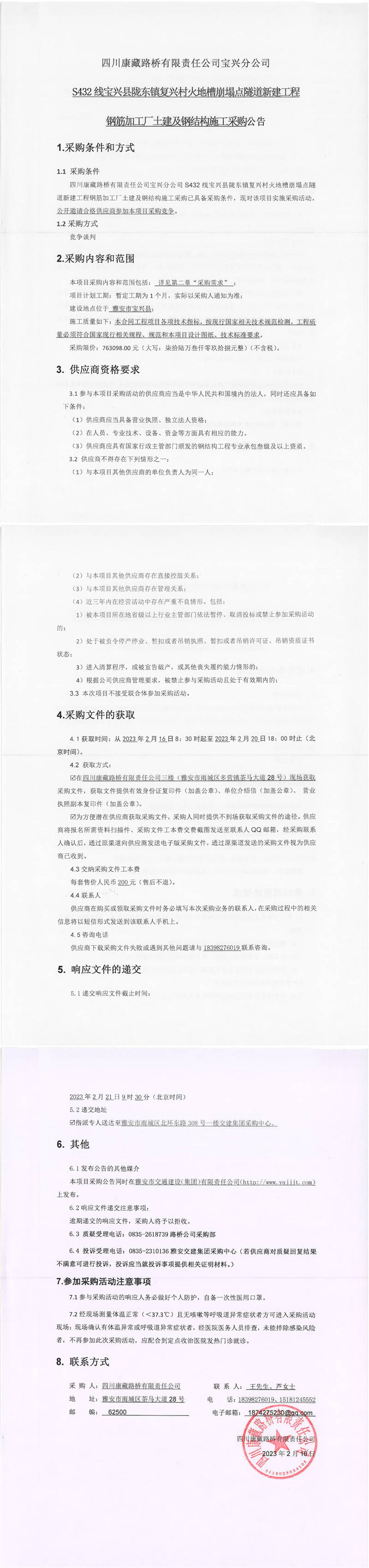 四川康藏路橋有限責(zé)任公司寶興分公司S432線寶興縣隴東鎮(zhèn)復(fù)興村火地槽崩塌點(diǎn)隧道新建工程鋼筋加工廠土建及鋼結(jié)構(gòu)施工采購公告