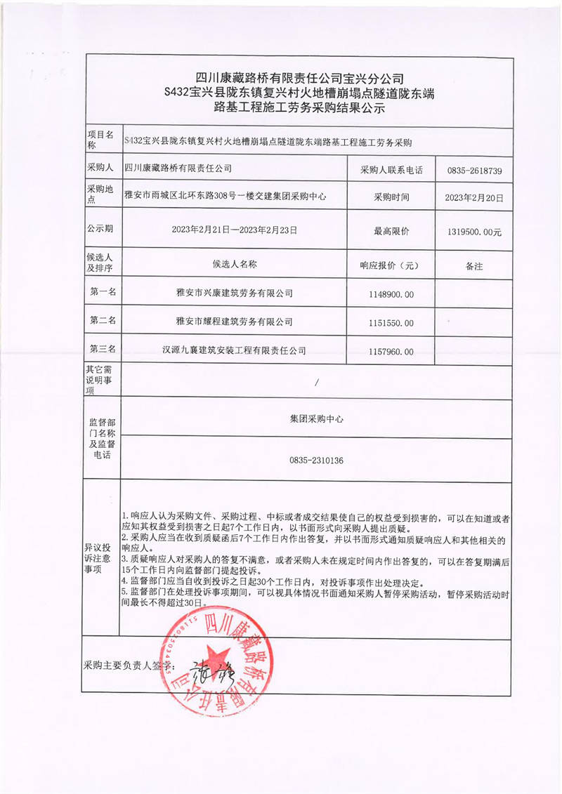 四川康藏路橋有限責任公司寶興分公司S432寶興縣隴東鎮(zhèn)復(fù)興村火地槽崩塌點隧道隴東端路基工程施工勞務(wù)采購結(jié)果公示