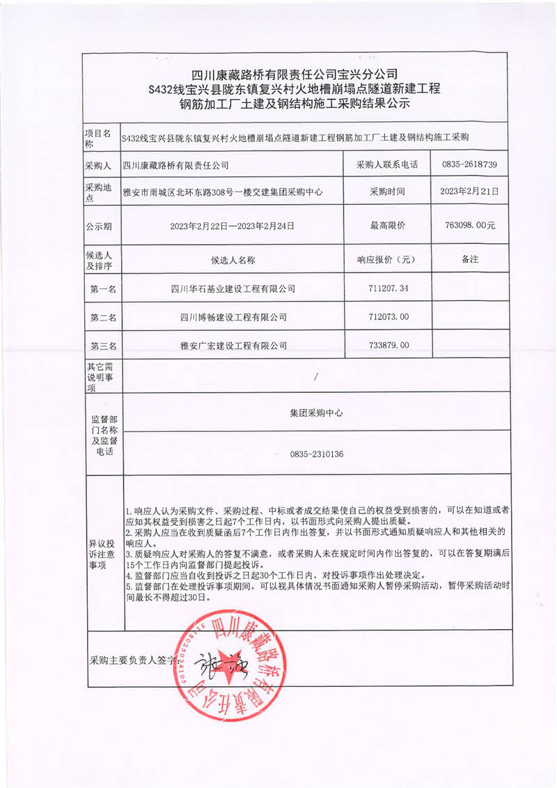 四川康藏路橋有限責(zé)任公司寶興分公司S432寶興縣隴東鎮(zhèn)復(fù)興村火地槽崩塌點(diǎn)隧道新建工程鋼筋加工廠土建及鋼結(jié)構(gòu)施工采購(gòu)結(jié)果公示