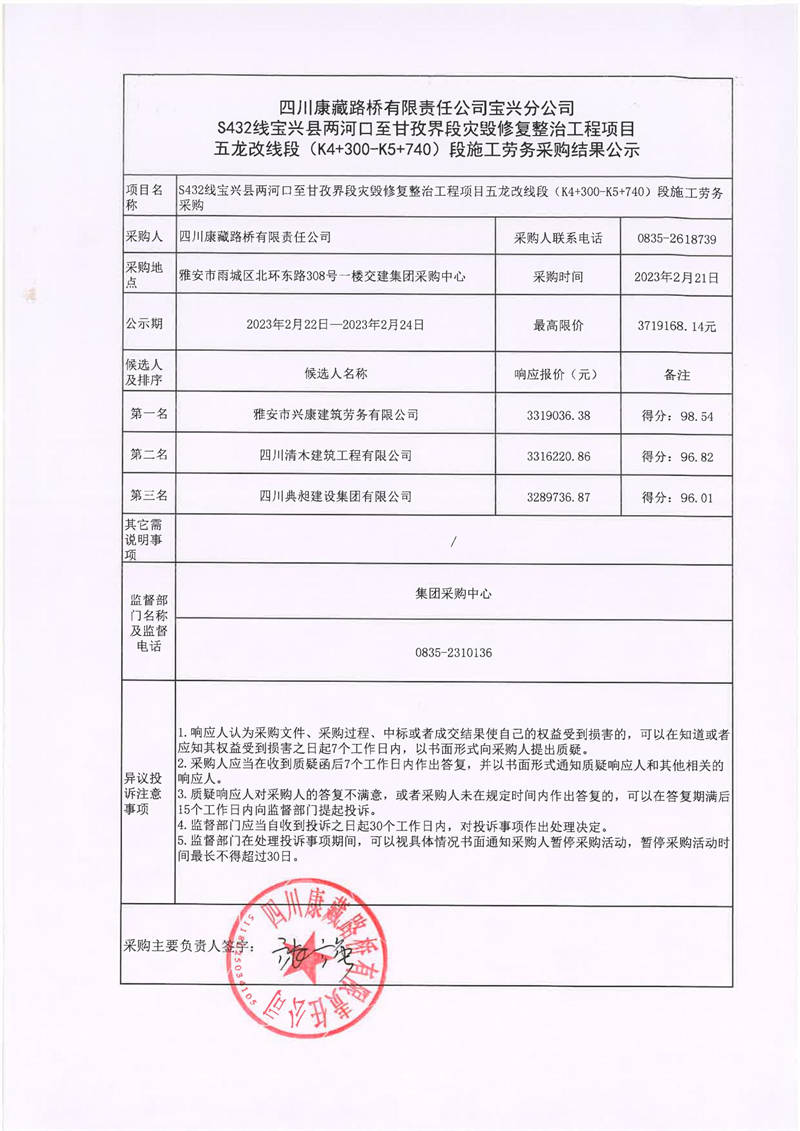 四川康藏路橋有限責(zé)任公司寶興分公司S432寶興縣兩河口至甘孜界段災(zāi)毀修復(fù)整治工程項目五龍改線段(K4+300-K5+740)段施工勞務(wù)采購結(jié)果公示