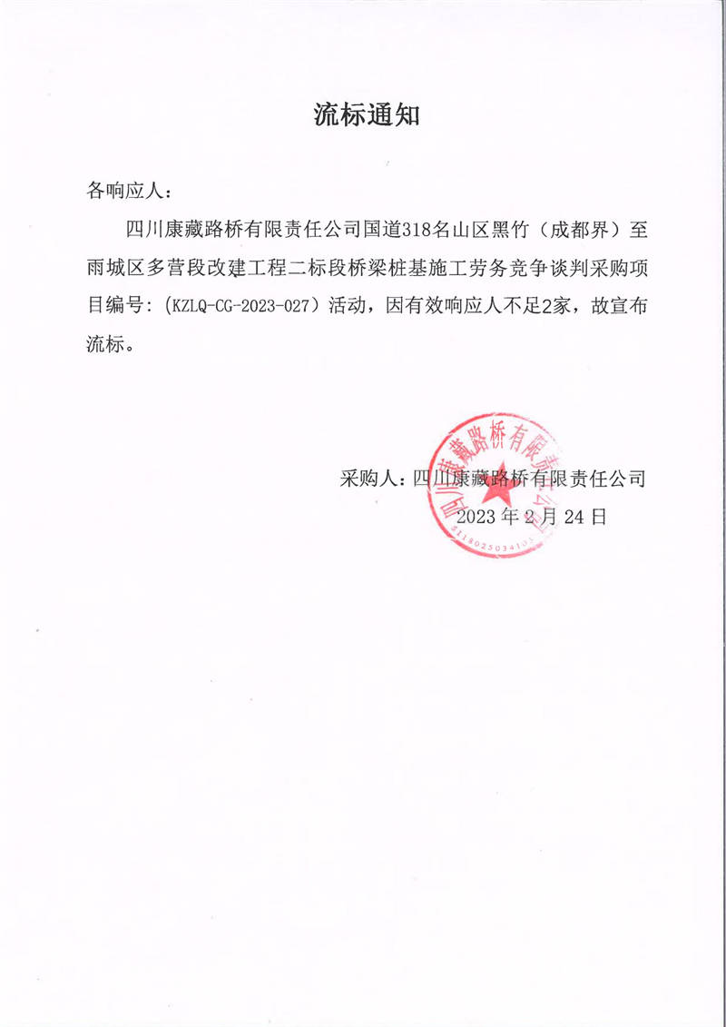 四川康藏路橋有限責任公司國道318名山區(qū)黑竹(成都界)至雨城區(qū)多營段改建工程二標段橋梁樁基施工勞務(wù)競爭談判采購流標通知