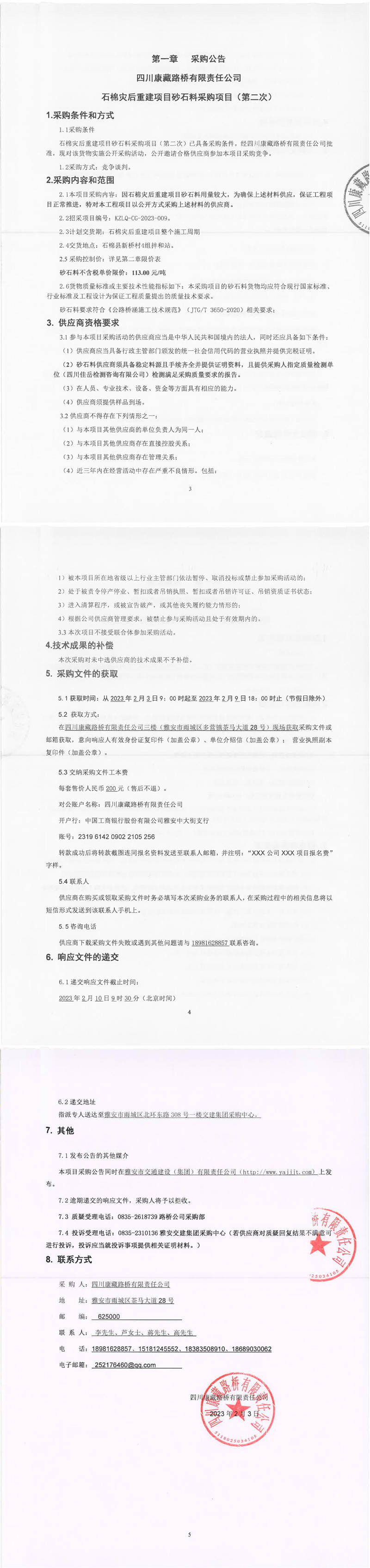 四川康藏路橋有限責(zé)任公司石棉災(zāi)后重建項(xiàng)目砂石料采購項(xiàng)目(第二次)采購公告