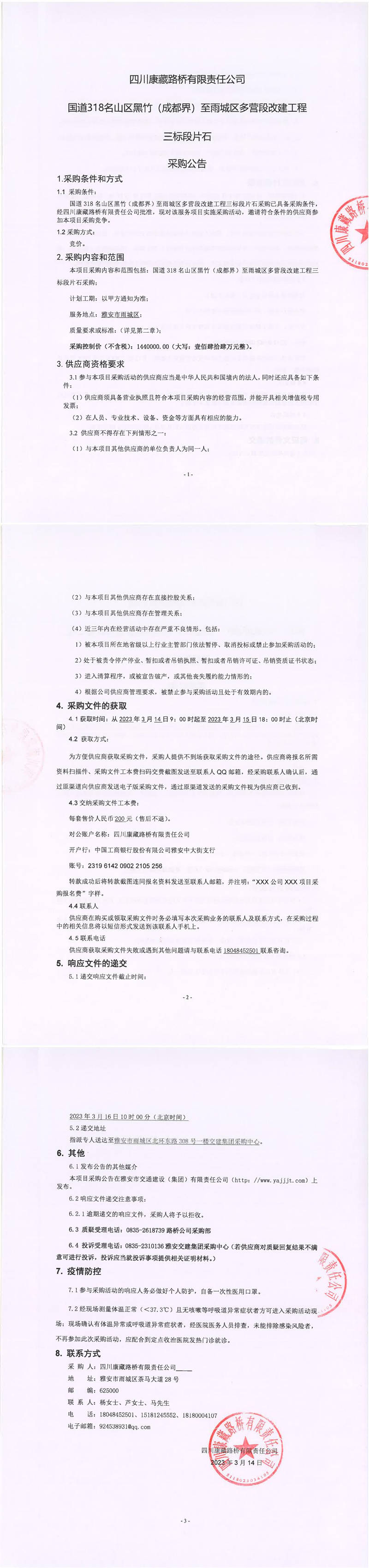 四川康藏路橋有限責(zé)任公司國(guó)道318名山區(qū)黑竹(成都界)至雨城區(qū)多營(yíng)段改建工程三標(biāo)段片石采購(gòu)公告