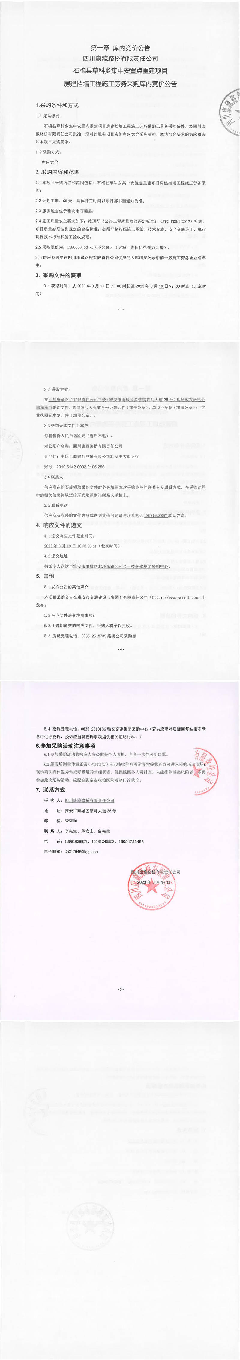 四川康藏路橋有限責(zé)任公司石棉草科鄉(xiāng)集中安置點(diǎn)重建項(xiàng)目房建擋墻工程施工勞務(wù)采購庫內(nèi)競價公告