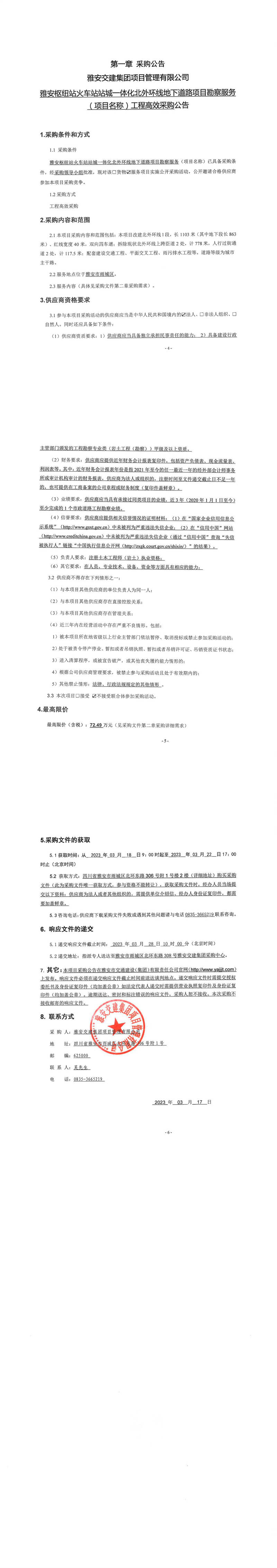 雅安交建集團(tuán)項(xiàng)目管理有限公司雅安樞紐站火車站站城一體化北外環(huán)線地下道路項(xiàng)目勘察服務(wù)(項(xiàng)目名稱)工程高效采購(gòu)公告