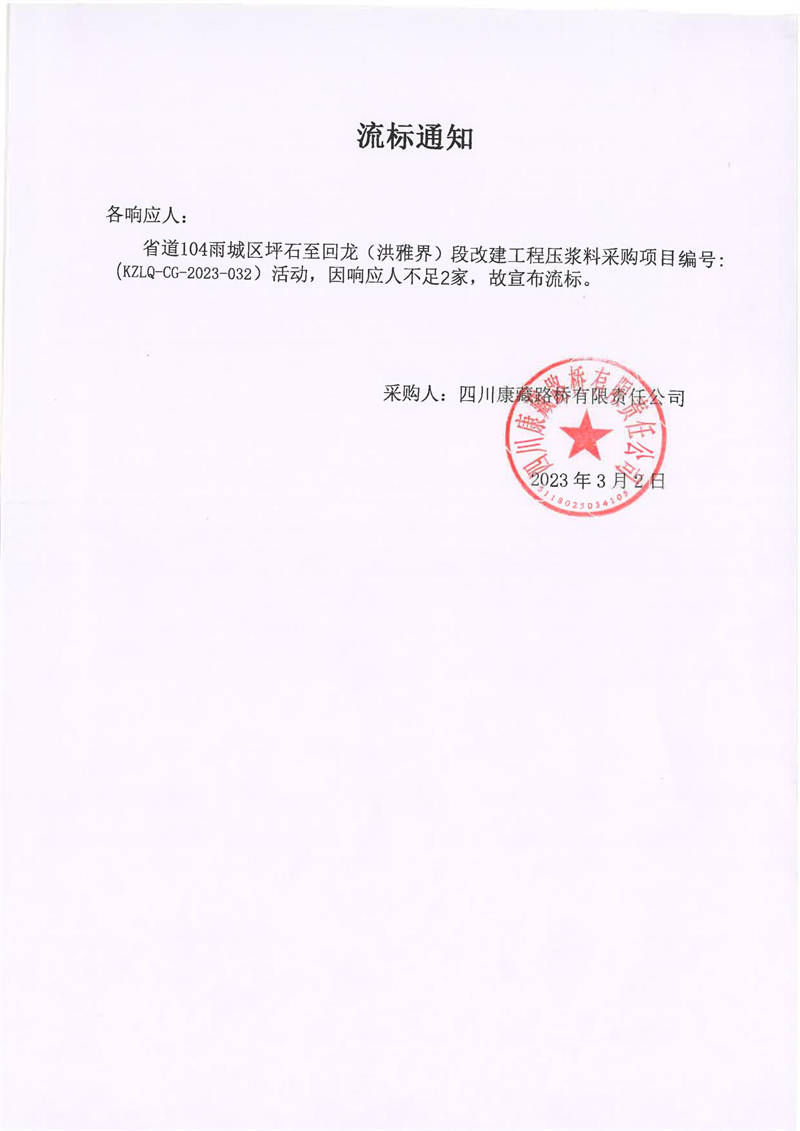 四川康藏路橋有限責任公司省道104雨城區(qū)坪石至回龍(洪雅界)段改建工程壓漿料采購流標通知