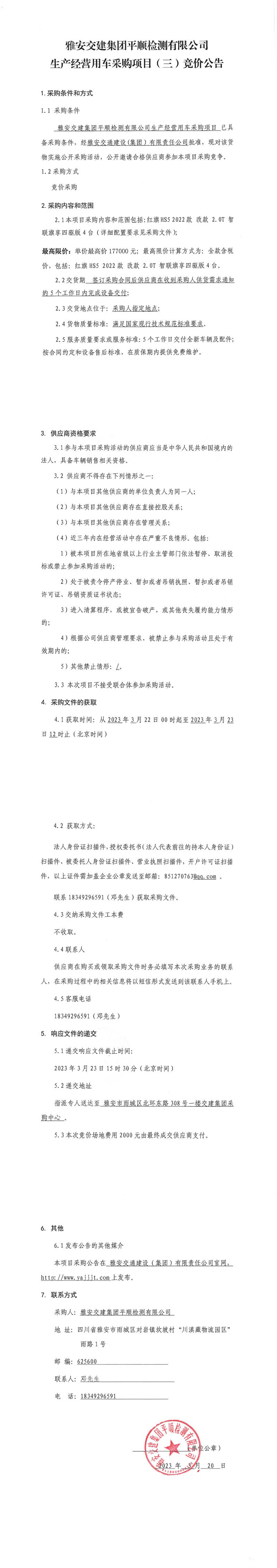 雅安交建集團(tuán)平順檢測(cè)有限公司平順公司生產(chǎn)經(jīng)營(yíng)用車采購(gòu)項(xiàng)目(二)競(jìng)價(jià)公告