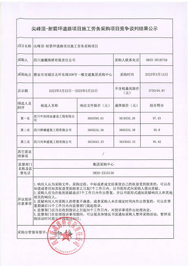 四川康藏路橋有限責(zé)任公司尖峰頂-射箭坪道路項(xiàng)目施工勞務(wù)采購(gòu)項(xiàng)目競(jìng)爭(zhēng)談判結(jié)果公示