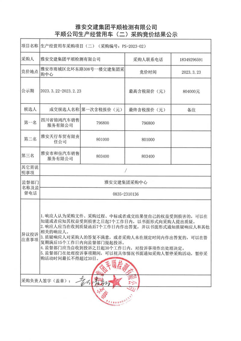 雅安交建集團(tuán)平順檢測有限公司平順公司生產(chǎn)經(jīng)營用車(二)采購競價(jià)結(jié)果公示