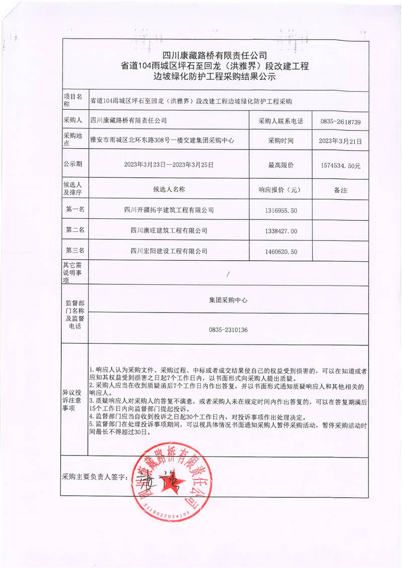 四川康藏路橋有限責任公司省道104雨城區(qū)坪石至回龍(洪雅界)段改建工程邊坡綠化防護工程采購結(jié)果公示