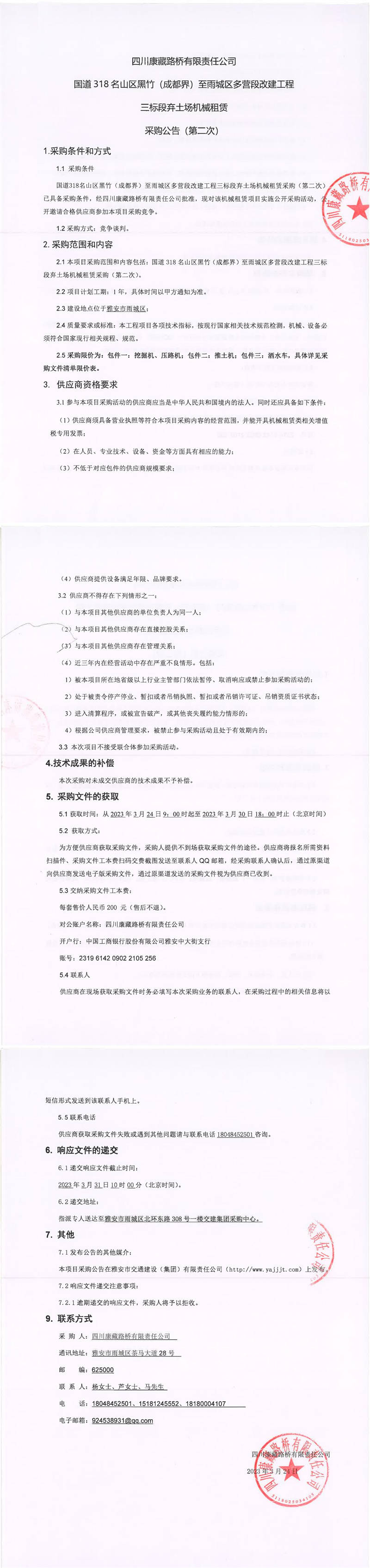 四川康藏路橋有限責(zé)任公司國道318名山區(qū)黑竹(成都界)至雨城區(qū)多營段改建工程三標(biāo)段棄土場機械租賃采購公告(第二次)