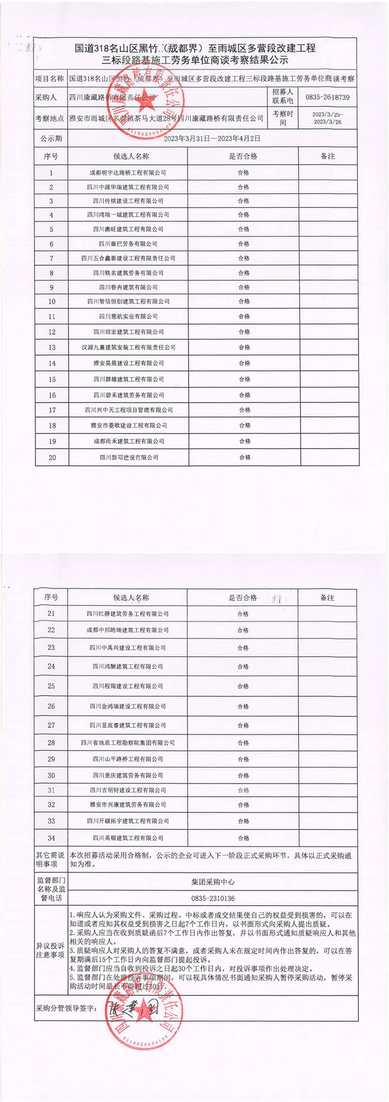四川康藏路橋有限責(zé)任公司國(guó)道318名山區(qū)黑竹(成都界)至雨城區(qū)多營(yíng)段改建工程三標(biāo)段路基施工勞務(wù)單位商談考察結(jié)果公示