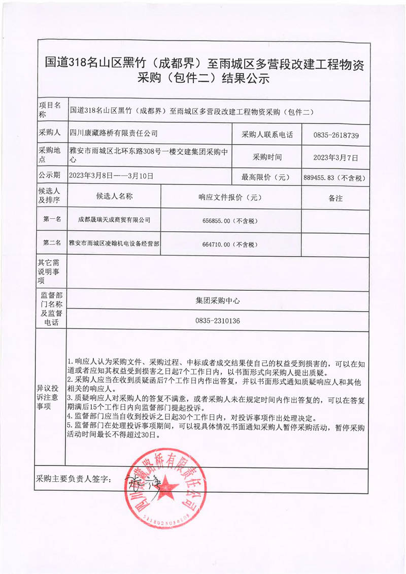 四川康藏路橋有限責任公司國道318名山區(qū)黑竹(成都界)至雨城區(qū)多營段改建工程物資采購(包件二)結(jié)果公示