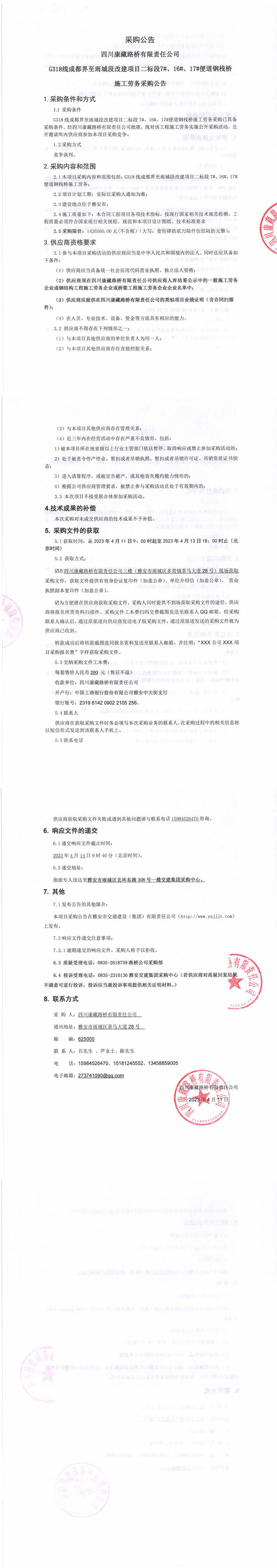 四川康藏路橋有限責任公司G318線成都界至雨城段改建項目二標段7#、16#、17#便道鋼棧橋施工勞務采購公告