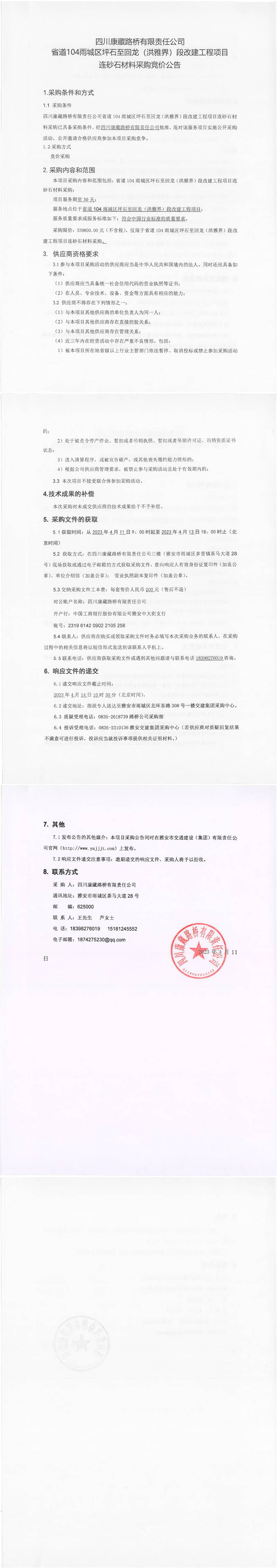 四川康藏路橋有限責(zé)任公司省道104雨城區(qū)坪石至回龍(洪雅界)段改建工程項目連砂石材料采購競價公告