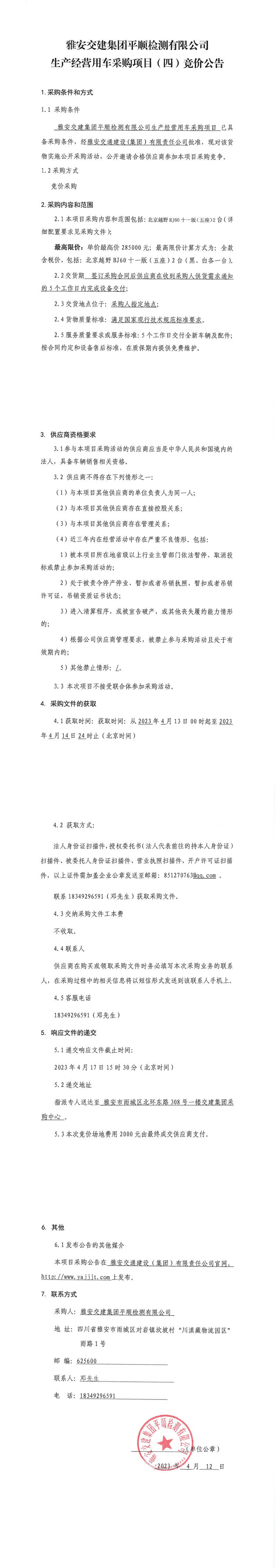 雅安交建集團平順檢測有限公司平順公司生產(chǎn)經(jīng)營用車采購項目(四)競價公告