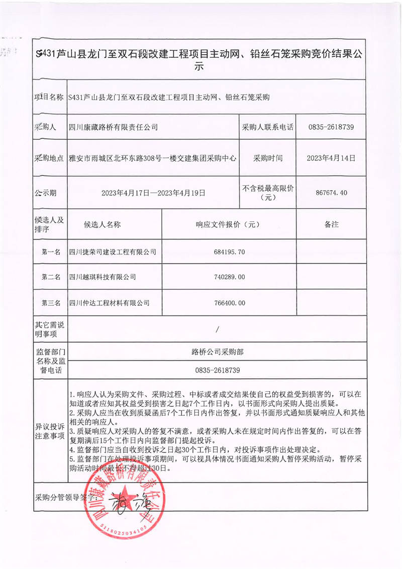 四川康藏路橋有限責(zé)任公司S431蘆山縣龍門(mén)至雙石段改建工程項(xiàng)目主動(dòng)網(wǎng)、鉛絲石籠采購(gòu)競(jìng)價(jià)結(jié)果公示