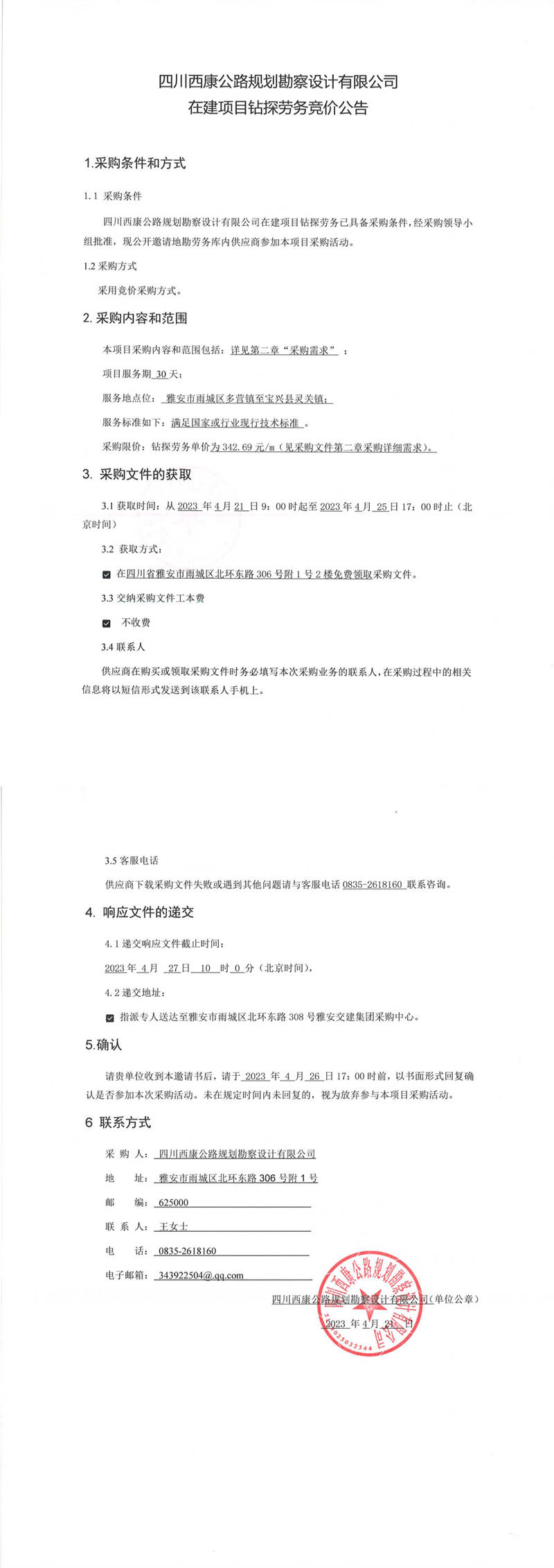 四川西康公路規(guī)劃勘察設(shè)計公司在建項目鉆探勞務(wù)競價公告