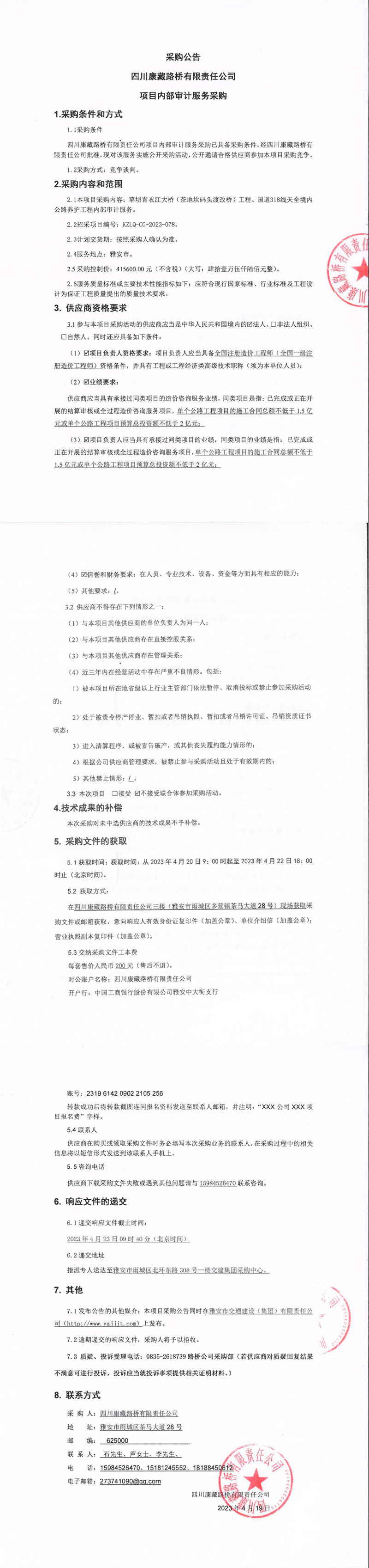四川康藏路橋有限責(zé)任公司項(xiàng)目?jī)?nèi)部審計(jì)服務(wù)采購公告