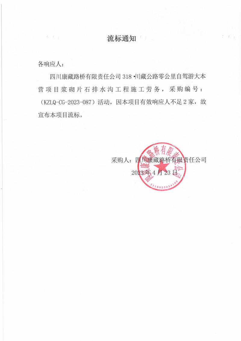 四川康藏路橋有限責任公司318·川藏公路零公里自駕游大本營項目漿砌片石排水溝工程施工勞務流標通知