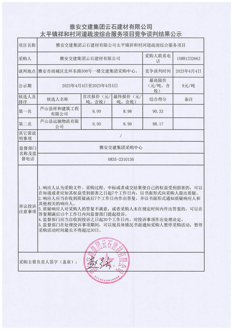 雅安交建集團云石建材有限公司太平鎮(zhèn)祥和村河道疏浚綜合服務(wù)項目競爭談判結(jié)果公示