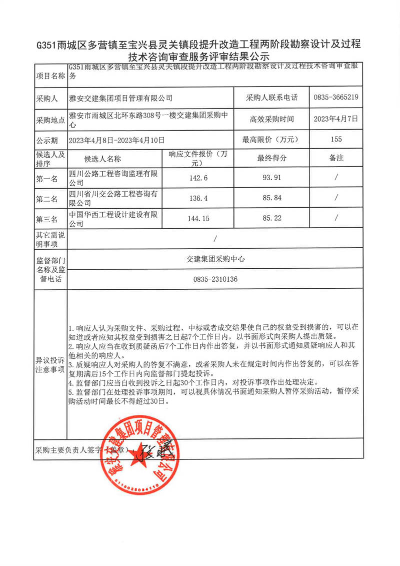 雅安交建集團項目管理有限公司G351雨城區(qū)多營鎮(zhèn)至寶興縣靈關(guān)鎮(zhèn)段提升改造工程兩階段勘察設(shè)計及過程技術(shù)咨詢審查服務(wù)評審結(jié)果公示