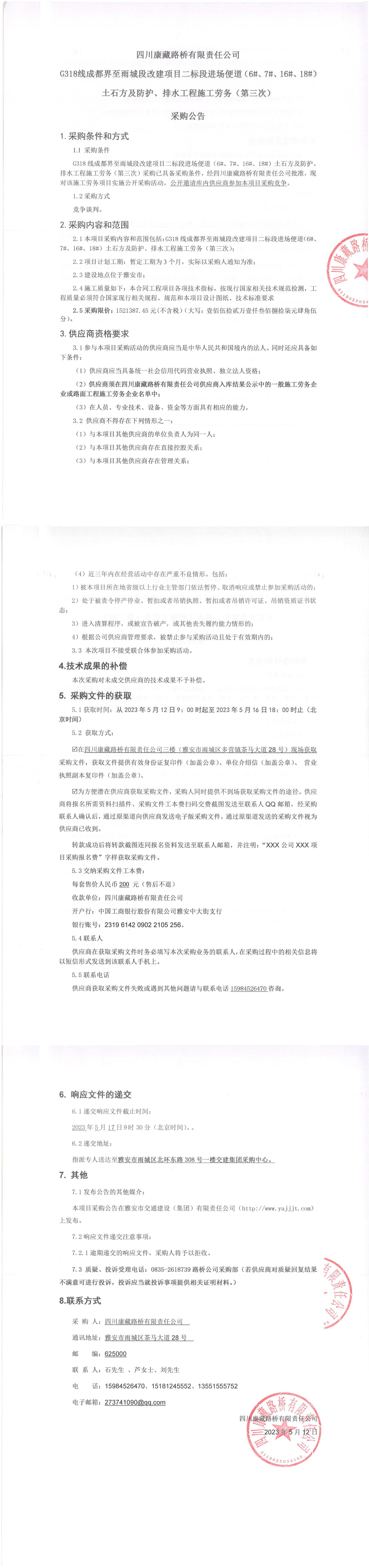 四川康藏路橋有限責任公司G318線成都至雨城段改建項目二標段進場便道(6#、7#、16#、18#)土石方及防護、排水工程施工勞務(wù)(第三次)采購公告