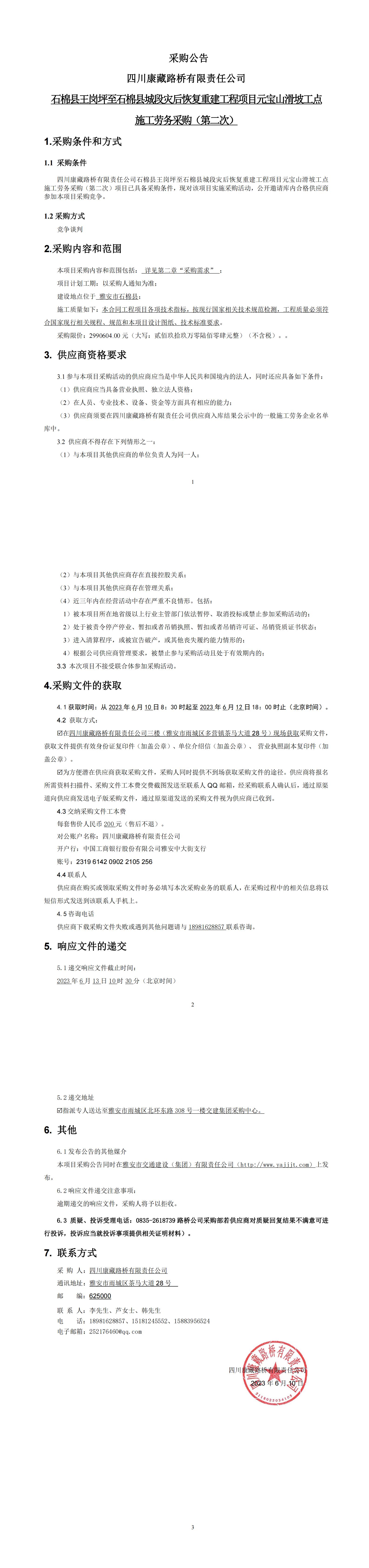 四川康藏路橋有限責(zé)任公司“9·5”瀘定地震石棉縣農(nóng)村公路災(zāi)后恢復(fù)重建工程項(xiàng)目混凝土路面工程施工勞務(wù)采購(第二次)庫內(nèi)競(jìng)價(jià)公告