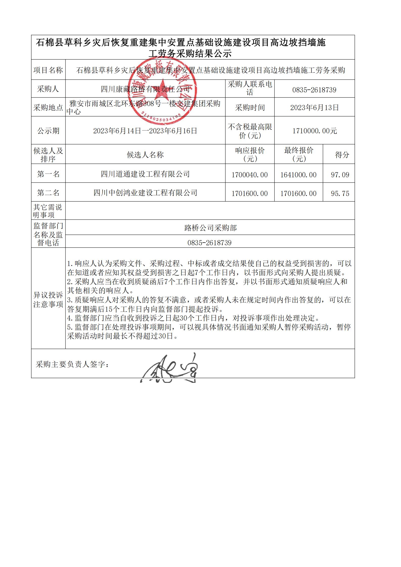 四川康藏路橋有限責任公司石棉縣草科鄉(xiāng)災后恢復重建集中安置點建設項目農家村村委會邊坡防護工程施工勞務采購(第三次)結果公示