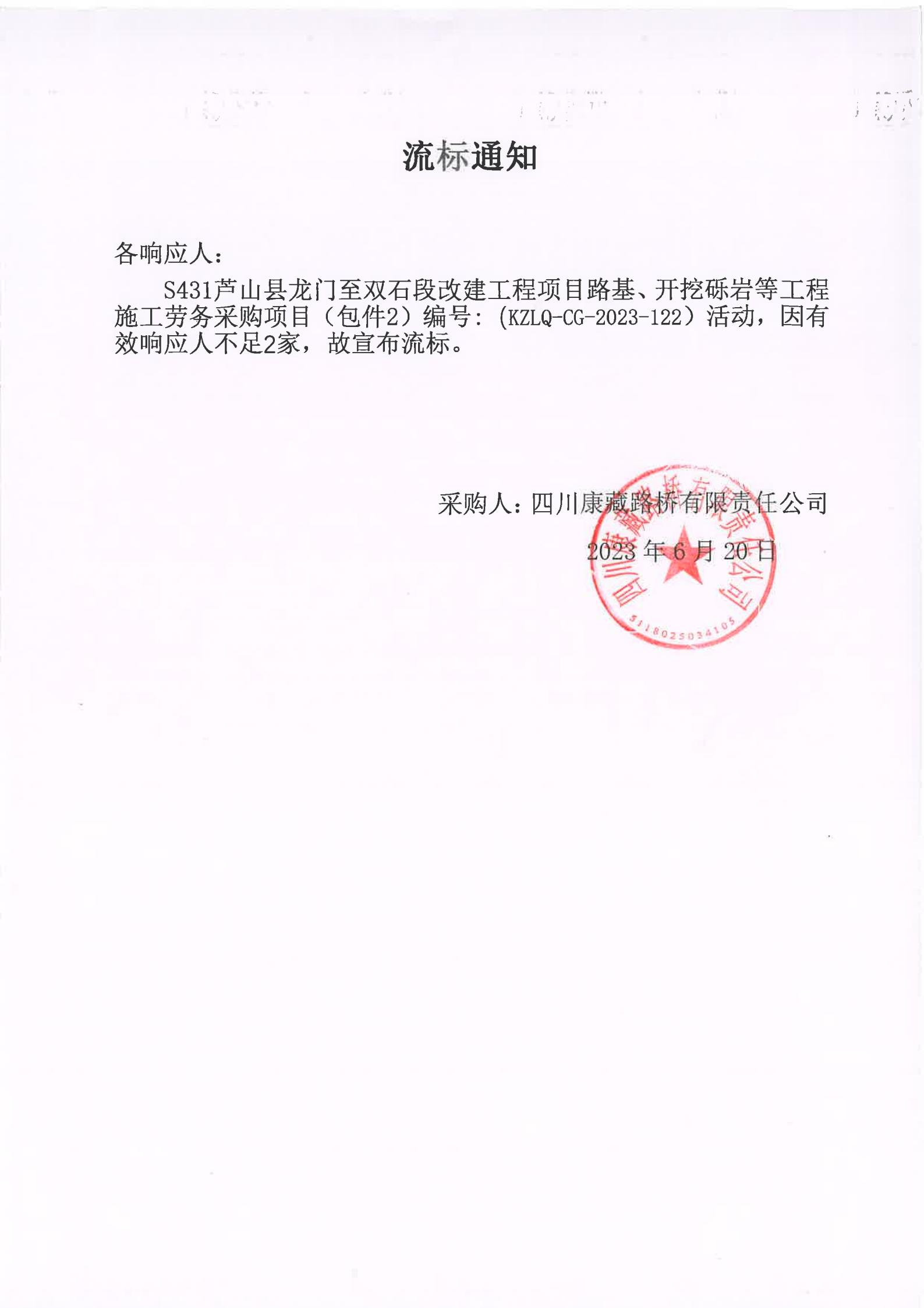 四川康藏路橋有限責(zé)任公司S431蘆山縣龍門至雙石段改建工程項目路基、開挖礫巖等工程施工勞務(wù)采購(包件2)流標(biāo)通知