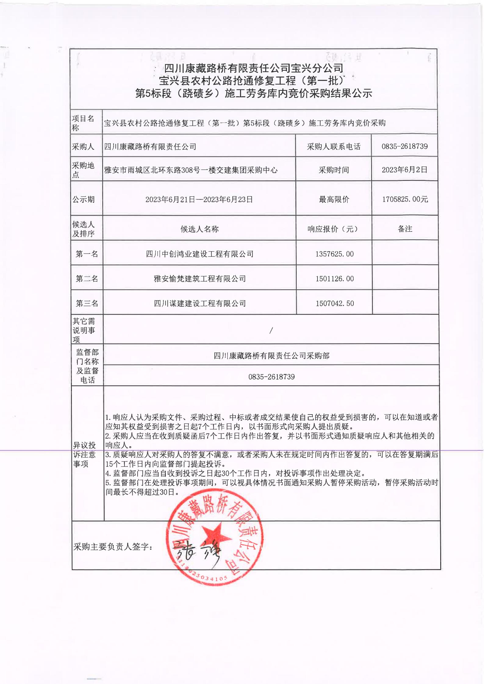 四川康藏路橋有限責(zé)任公司寶興分公司寶興縣農(nóng)村公路搶通修復(fù)工程(第一批)第5標段(蹺磧鄉(xiāng))施工勞務(wù)庫內(nèi)競價采購結(jié)果公示